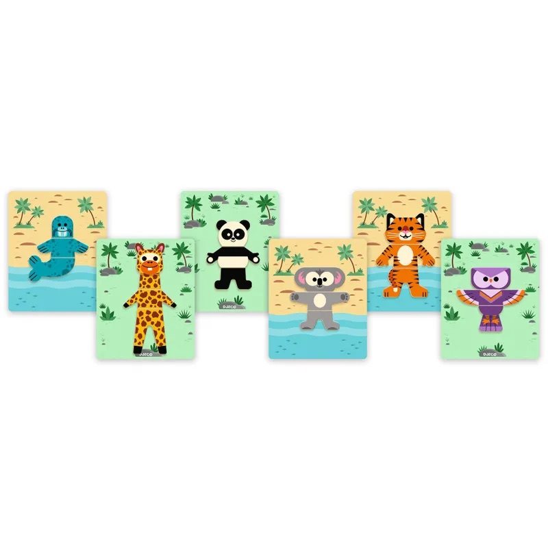Barn kan försöka återskapa de 8 djur som finns på modellkorten, genom att välja den sidan av boxen som visar rätt bakgrund och sätta dit rätt bitar. Eller så kan hen använda fantasin och skapa sina egna roliga kombinationer. Perfekt att underhålla sig med under resor.