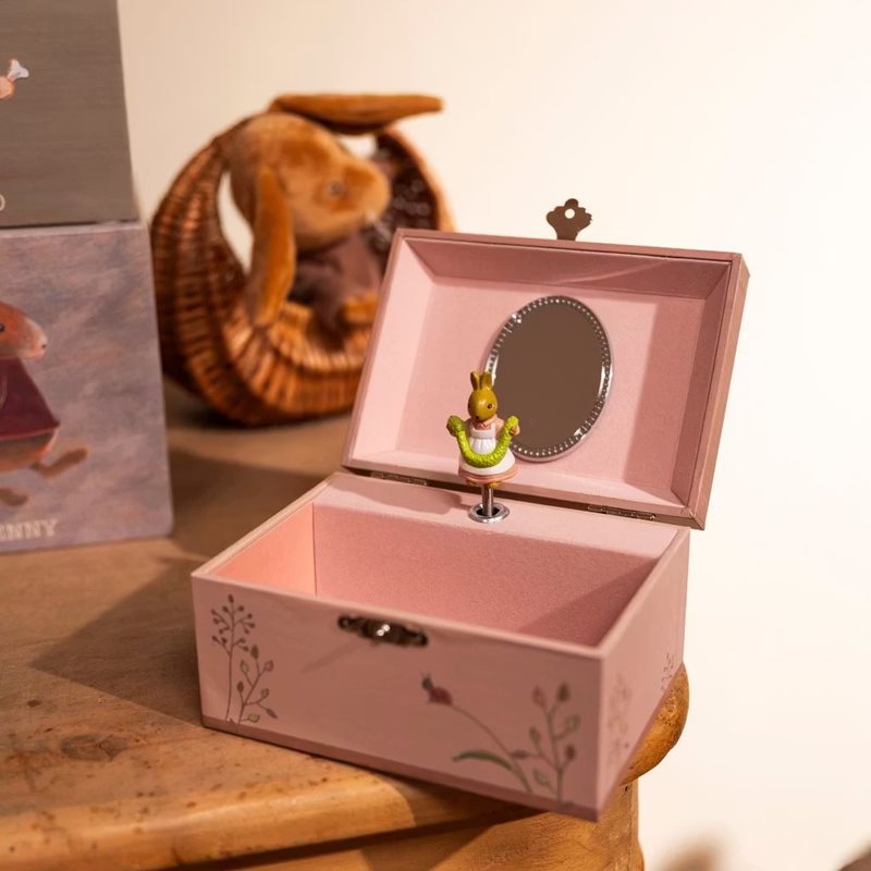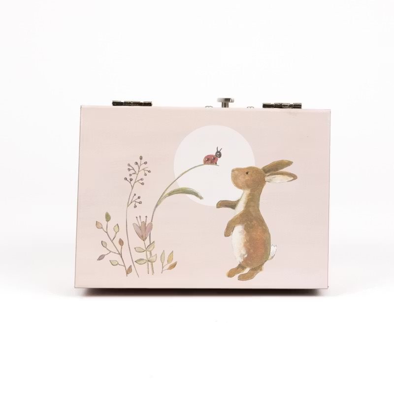 Låt fantasin flöda! Detta bedårande smyckeskrin har en vackert illustrerad kanin & nyckelpiga och öppnas till ljudet av en fin melodi. Inuti snurrar en charmig liten kanin framför en spegel. Med mjuka pastelltoner och plats för att förvara små skatter är det den perfekta presenten till födelsedagar och andra ögonblick.